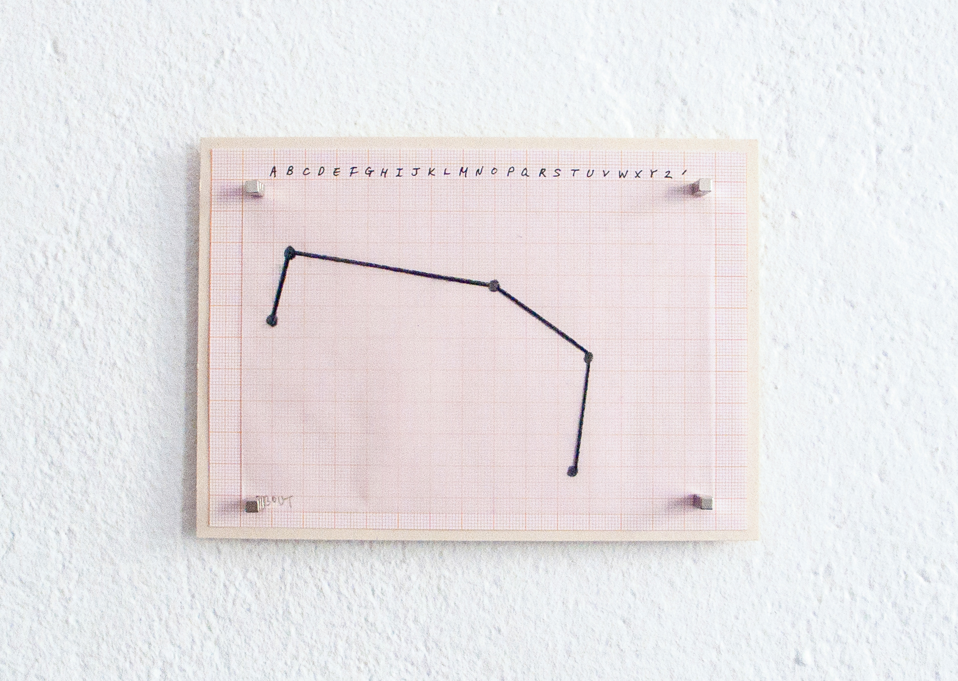 The second one, About Licht light, has inspired Saebom to create a new poem and sound. From the mistake of writing caused by the confusion between two languages – ‘Licht and light’ -, she wrote the poem based on the rhythm and phonetic of both English and German. The poem was then translated into drawings based on a translation system, which Yoonhee made for her former artistic practice: each letter from this poem is rearranged/positioned on a grid as dot and the lines are drawn between the dots. Furthermore, the piano-key sound for each letter is based on the algorithm between alphabets and synthesizer-keyboard: this way, the first poetry becomes a musical sound. (for example, A with Do, B with Re and so on.)